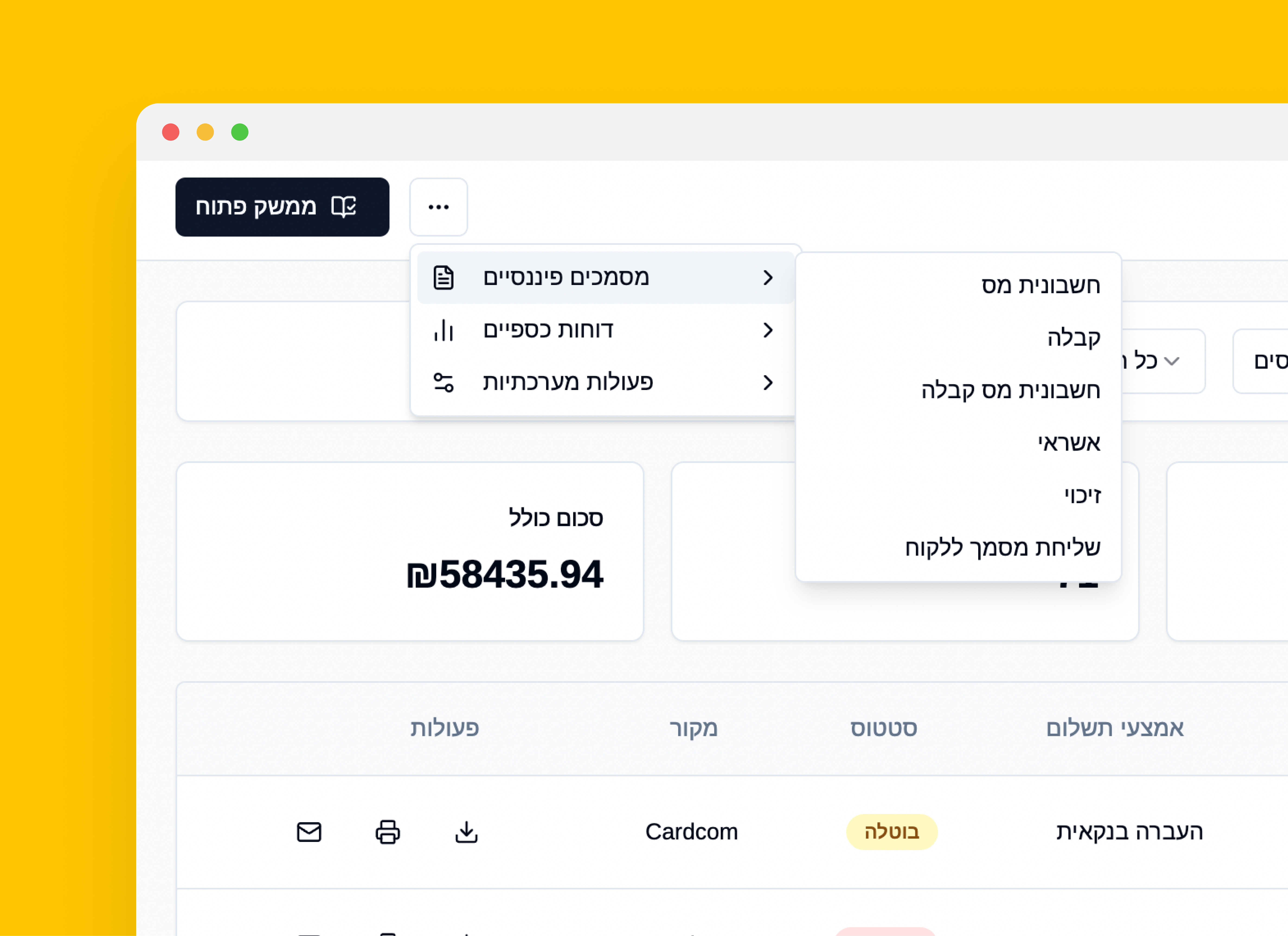כל הפעילות במקום אחד: הזמנות, תשלומים, לקוחות, משלוחים ודוחות.